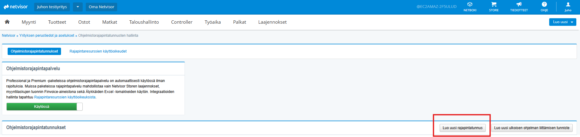 Netvisorin ohjelmistorajapintatunnukset ovat käyttäjäkohtaisia. Tämä tarkoittaa sitä, että kukin käyttäjä voi luoda ohjelmistorajapintatunnuksia vain itselleen, ja rajapintatunnukset toimivat niissä yrityksissä, joihin käyttäjällä on käyttöoikeus.