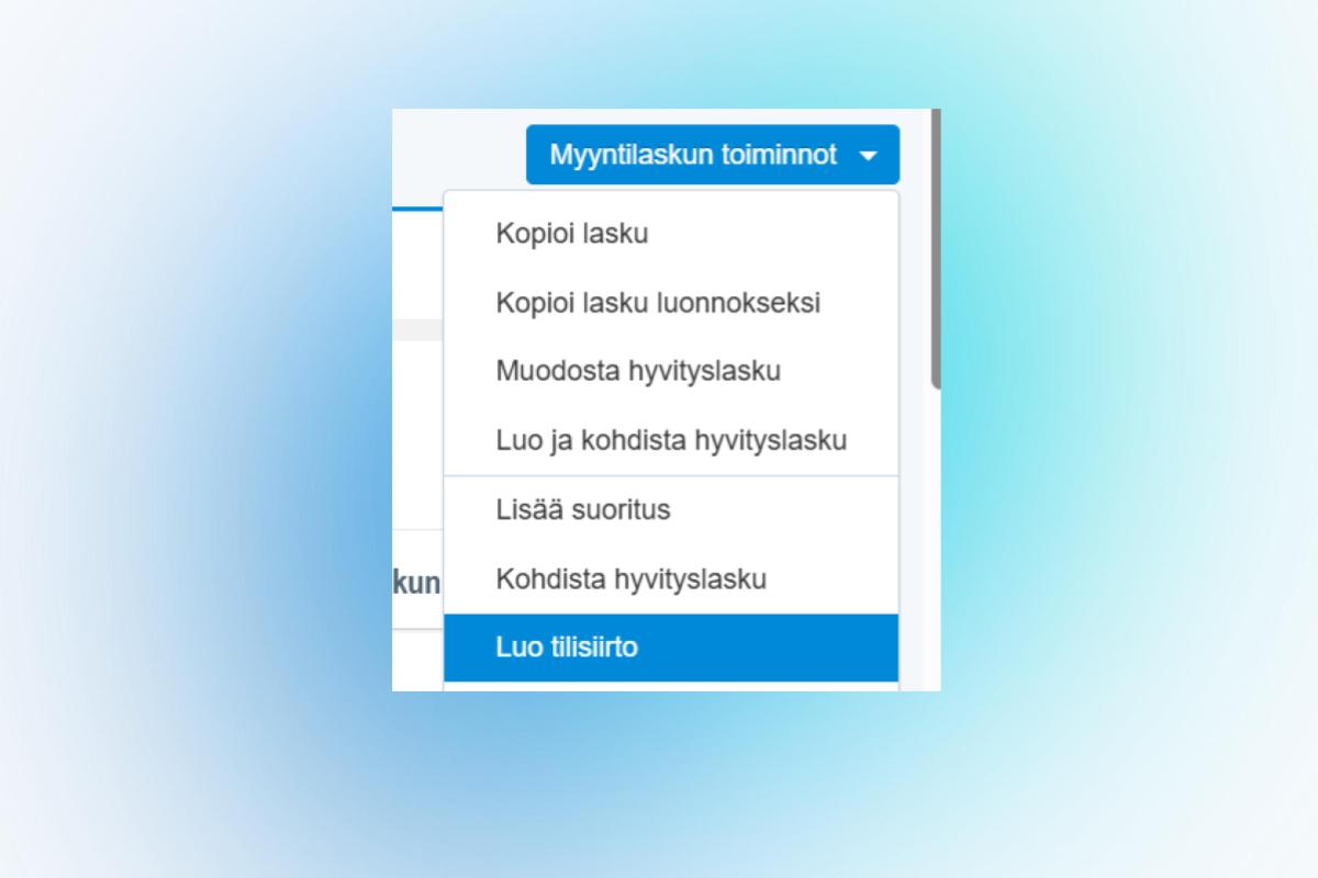Olemme lisänneet saamamme asiakaspalautteen perusteella mahdollisuuden luoda tilisiirron suoraan hyvityslaskusta ja ylisuorituksesta. Uusi toiminto löytyy suoraan laskulta valikosta: Myyntilaskun toiminnot > Luo tilisiirto.