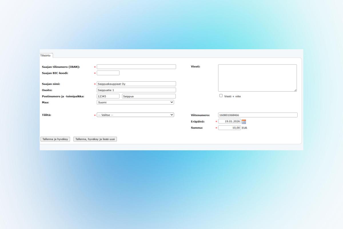 Muodostuvalle tilisiirrolle tulee automaattisesti saajan tiedot, laskun viitenumero ja maksettava summa. Eräpäiväksi muodostuu oletuksena laskun eräpäivä. Mikäli laskun eräpäivä on mennyt, niin tällöin tilisiirron eräpäiväksi tulee se päivä kun tilisiirto luodaan. Uuden toiminnon avulla voitte käsitellä entistä nopeammin mahdolliset rahanpalautustilanteet myyntireskontrassa.