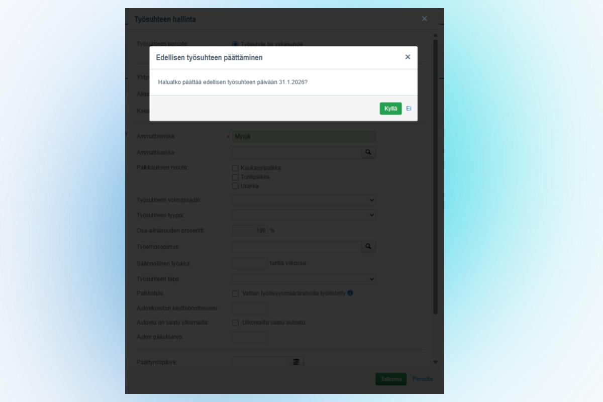 We have added a new automation feature to the management of employment details. When adding a new employment contract, a dialog will appear. By accepting it, the previous contract is automatically terminated on the day preceding the start date of the new contract. This new feature streamlines employment management.