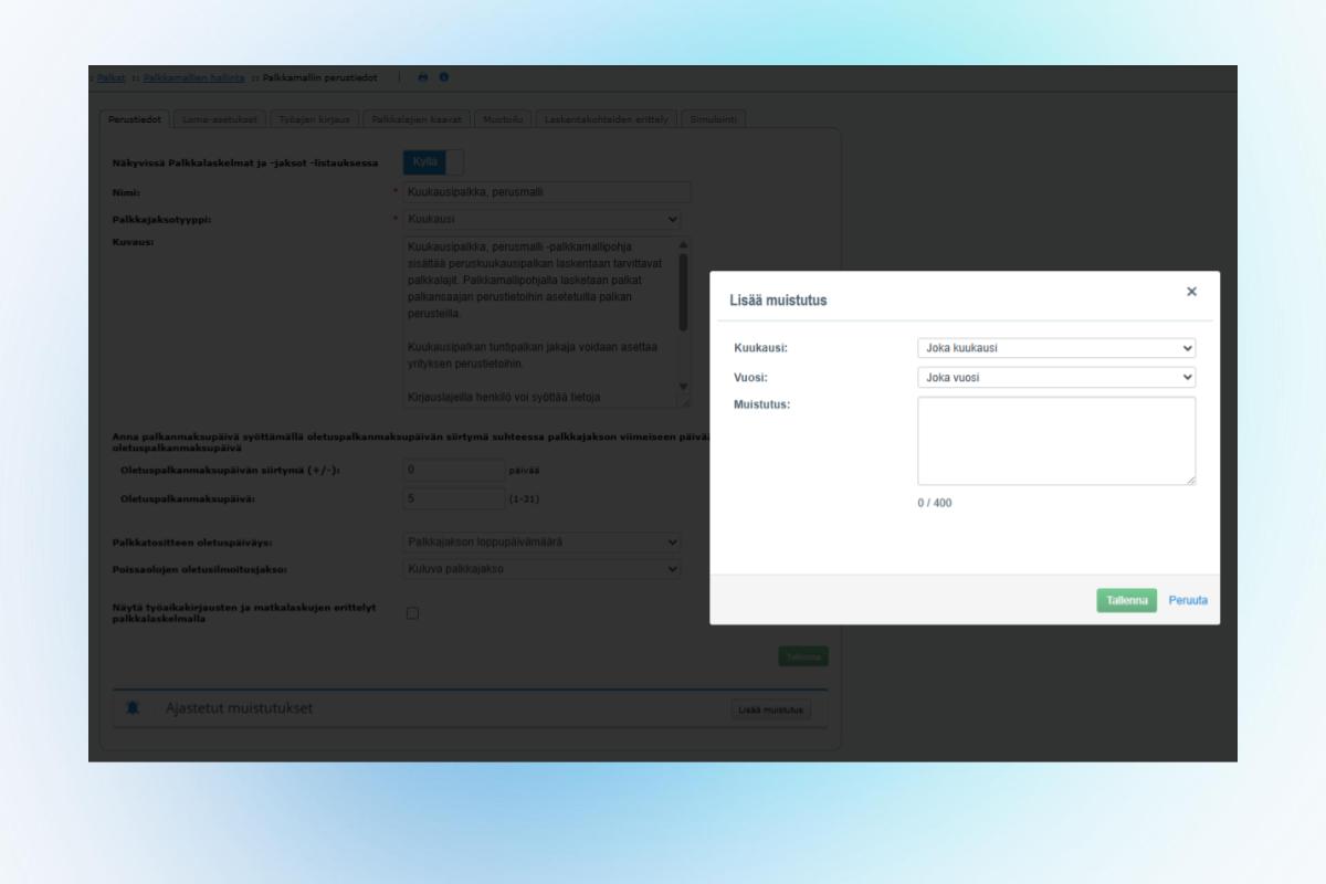 Lisäsimme palkkamallin asetuksiin uuden ominaisuuden, jonka avulla voit luoda palkkamallikohtaisia muistutuksia. Voit lisätä ajastetun muistutuksen suoraan palkkamallin asetuksista. Asetettu muistutus näytetään palkanlaskijalle palkkaprosessin aikana Palkkaperusteiden tarkistus -näkymässä. Toiminnallisuuden avulla palkanlaskija voi vähentää muistikuormaa ja varmistaa että palkkamallikohtaiset asiat tulee huomioitua palkkaprosessin aikana.