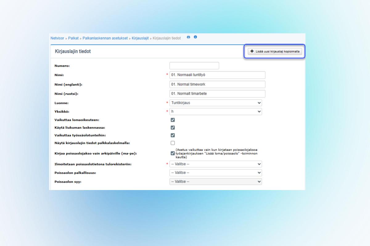 Olemme lisänneet palkanlaskentaan uuden toiminnallisuuden, joka nopeuttaa asetusten määrittämistä. Uuden kirjauslajin luominen onnistuu nyt helposti kopioimalla olemassa oleva kirjauslaji uuden pohjaksi. Kopiointi onnistuu avaamalla kirjauslaji, joka halutaan kopioida ja näkymän oikeasta yläkulmasta + Lisää uusi kirjauslaji kopioimalla