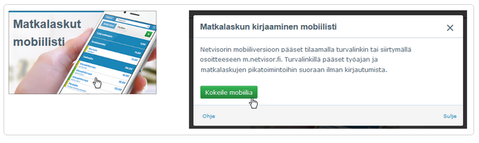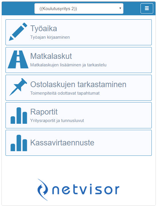 Travel expense reports and work hours can be managed in full version of Netvisor and in mobile version. Mobile interface is meant for mobile devices but it can be used in other devices as well. Mobile interface is available to Netvisor users and employees. User can choose if they want to use normal or mobile version.
