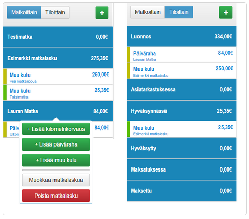 Travel expense reports mobile interface can be used via secure link, which is used to log working hours. Link directs you straight to the mobile version if link is opened in mobile device. Secure link is easy to send via text message (SMS) and via the link you will be able to create travel expense reports easily in your mobile phone. More about secure links: Logging work hours via secure links (in Finnish: Työajansyötön turvalinkit).