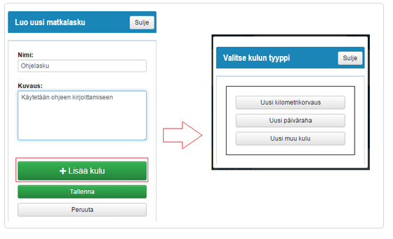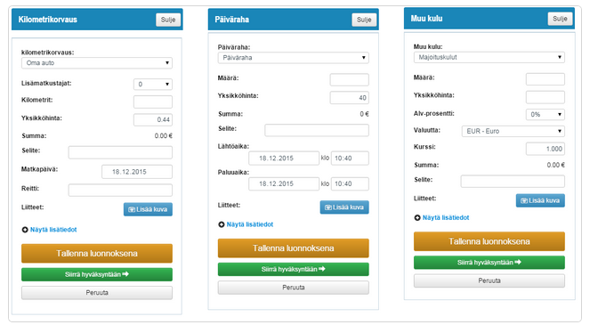 - Travel expense reports can be created and saved and expenses can be added later or expenses can be created straight after creation. After expense type has been selected, expense information can be given (see “Travel expense reports expenses”)