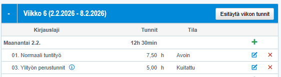 If it is not possible to add or edit a working hours row and the necessary icons are missing, check if the working hours entry lock is on for the pay period in the payroll settings.