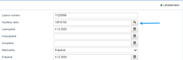 NOTE! If invoices are brought in via integration, the credit note must be brought in without a voucher. When the credit note is visible in Netvisor, you must fetch the correct invoice number information for the credit note from the Credited invoice section. This ensures that the information about the credited invoice is also sent to the Kassavirta Plus service.