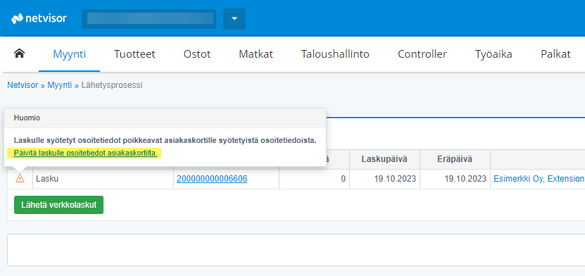 You can update the information on Netvisor's customer card to the invoice during the invoice sending process. The sending process shows an orange triangle if the information on the invoice differs from the customer card information or if there are other deficiencies on the invoice, for example, for sending an e-invoice. To update the information on the invoice, click on the orange triangle and then 'Update invoice address information from customer card':