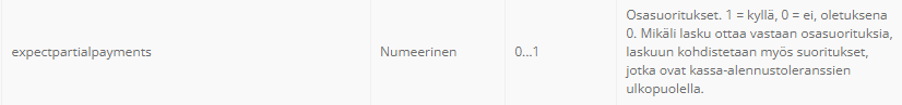 If partial payments are desired to automatically allocate to sales invoices imported from another software to Netvisor, the sales invoice message must provide a value of 1 in the expectpartialpayments field. More detailed documentation can be found at this link