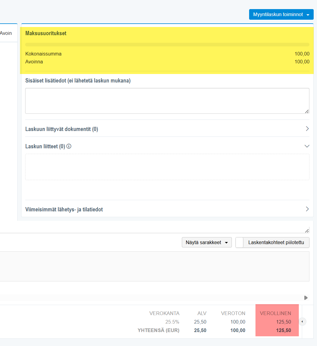 Option 2: Copy the debit invoice (Sales invoice actions - Copy invoice). When the invoice is copied, the copy will have a sum based on the invoice rows. The original debit invoice should be deleted in this case, and the related accounting voucher should be invalidated. This method is not recommended if the original invoice has already been sent to the customer.