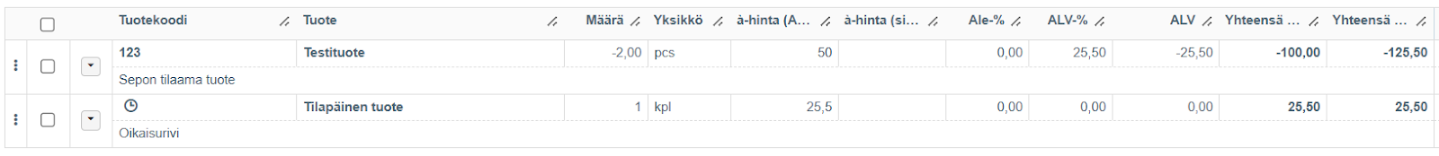 Option 1: Create a credit note from Sales invoice actions > Create credit note. When a credit note is created in Netvisor, the credit note amount is formed based on the invoice rows of the debit invoice. You can add one correction row to the credit note (for example, use a temporary product and as a description "correction row"), which will make the credit note amount match the debit invoice amount. In this case, the amount in the accounts receivable for the debit invoice is 100€, so correct the credit note amount to also be 100€.
