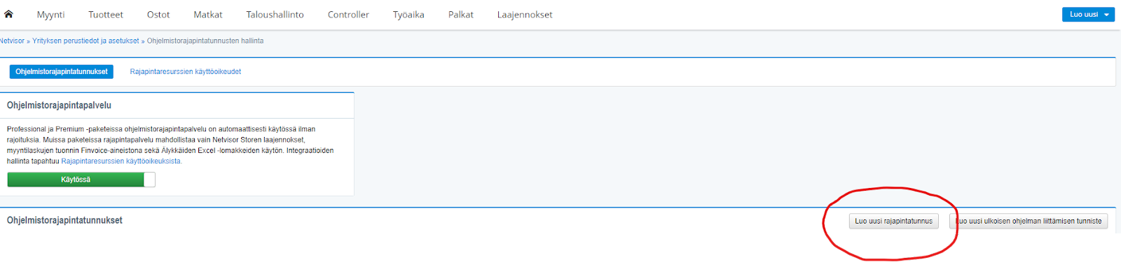 In such a situation, another user must create new api identifiers in Netvisor and forward them to the integrated system. Creating new api identifiers can be done through the company menu under Api identifiers -> Create new api identifier