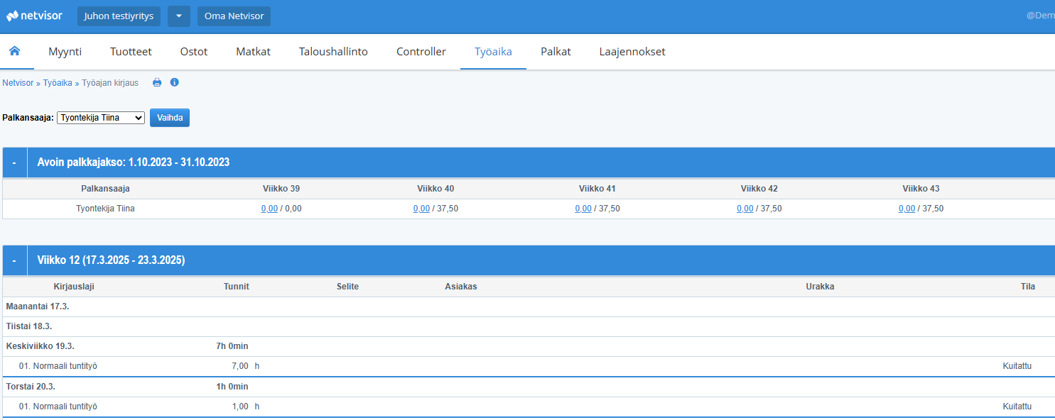 Location in Netvisor: Working hours entry view. Possible pay period-specific record rows also arrive in the same view if the integration allows for their import.