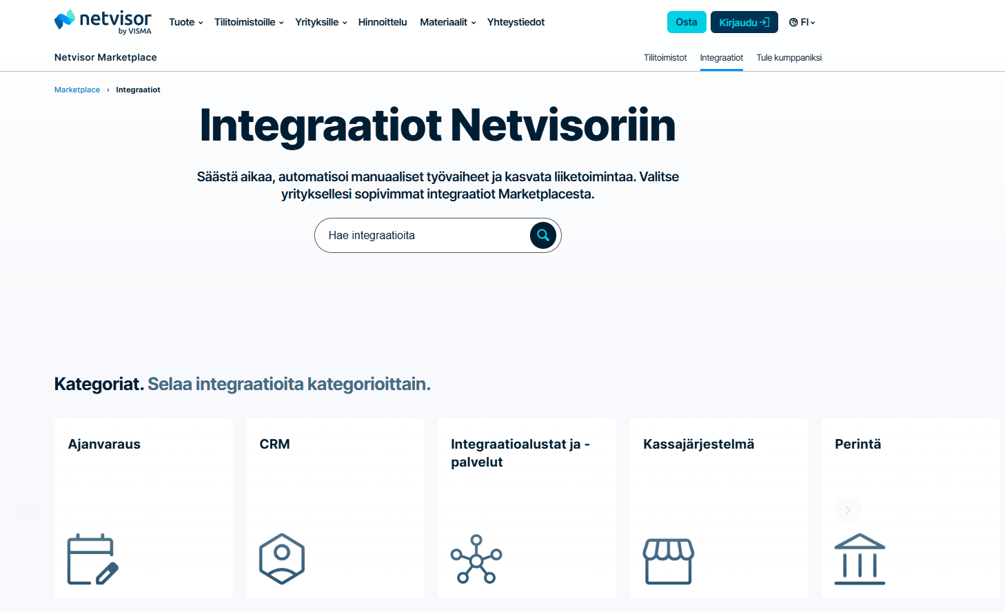Netvisor offers ready-made integrations for numerous different software, which can be easily and quickly implemented. Ready-made integrations can be searched on our updated Marketplace website by software name or by browsing available integrations by category or industry.