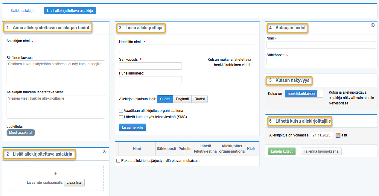 Allekirjoitettavaa asiakirjaa luodessa tähdellä merkityt kentät ovat pakollisia:
