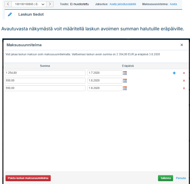 Jos asiakkaan kanssa on sovittu maksusuunnitelma, sen voi lisätä suoraan myyntilaskulle. Tämä tapahtuu avaamalla haluttu lasku ja valitsemalla laskun yläreunasta "Maksusuunnitelma: Aseta". Tämä onnistuu myös jo lähetetyille laskuille sekä lukitulla kaudella oleville laskuille. Maksusuunnitelman tulee kattaa koko laskun summa.