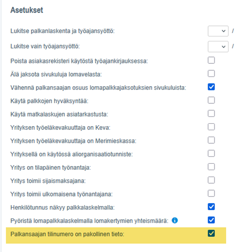 Palkanlaskennan asetuksissa mahdollistuus asettaa palkansaajan tilinumero pakolliseksi