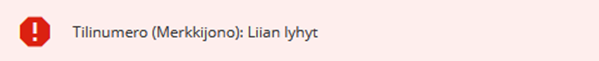 Mikäli palkansaajan tietoja yritetään tallentaa ja tilinumeroa ei ole annettu, antaa järjestelmä siitä oheisen virheilmoituksen.