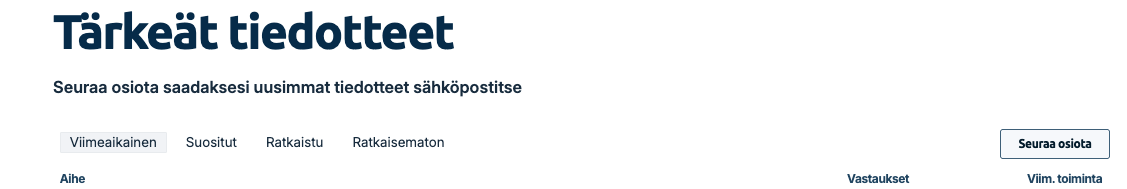 Netvisorin Community ja täällä oleva "Tärkeät tiedotteet"-osio on ensisijainen kanava jossa tiedotamme tuotteessa olevista poikkeustilanteista ja tuoteuudistuksista. Suosittelemme ottamaan Tärkeät tiedotteet-osion seurantaan "Seuraa osiota"-kohdasta, jolloin tiedotteet saa suoraan sähköpostiin. Tärkeät tiedotteet nousevat myös Netvisorin kirjautumissivulle joita suosittelemme pitämään silmällä.