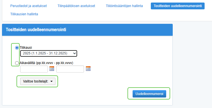 Pääset tekemään uudelleennumeroinnin: Taloushallinto > Kirjanpidon asetukset > Kirjanpidon ja velvoitteiden asetukset > Tositteiden uudelleennumerointi.