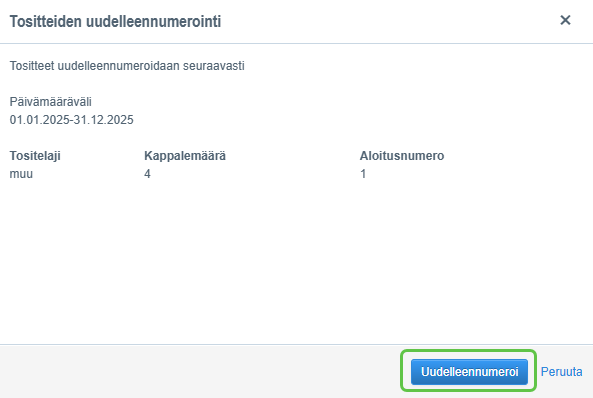 2. Tarkista valintasi sekä tositteiden määrä ja vahvista uudelleennumerointi painamalla Uudelleennumeroi.