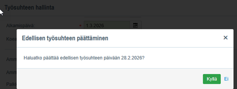 Mikäli valitset ”Kyllä” niin järjestelmä päättää automaattisesti edellisen työsuhteen uuden työsuhteen alkamispäivää edeltävään päivään.