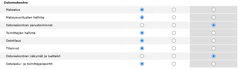 1. Toimintokohtaisissa oikeuksissa ostoreskontran alla tulee olla minimissään muokkausoikeudet ostoreskontrien perustoimintoihin ja ostoreskontrien näkymiin ja luetteloihin.