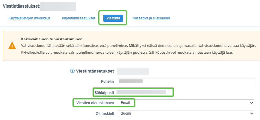 Käyttäjän Viestintä -välilehdellä määritellään viestintään liittyvät asetukset.