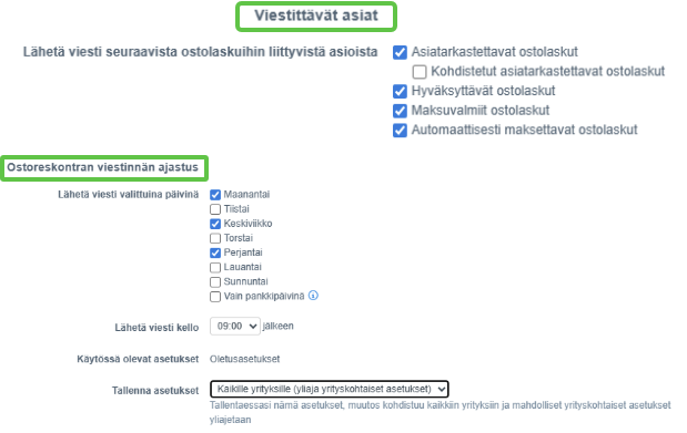 Varmistaakseen ostolaskujen oikea-aikaisen käsittelyn käyttäjä voi ottaa käyttöön sähköpostimuistutukset asiatarkastusta, hyväksyntää tai maksatusta odottavista ostolaskuista.