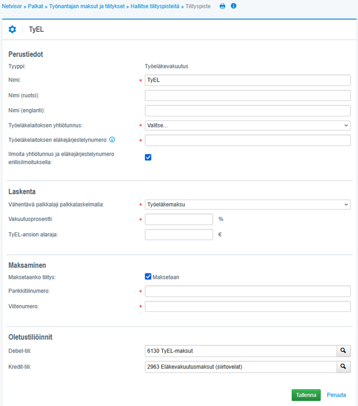 Tarkastele tilityspisteen tietoja. Näytettävät kentät riippuvat tilityspisteen "tyypistä". Alla oleva kuva on työeläkevakuutuksen tilityspisteen asetuksista.