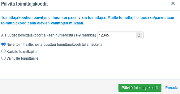 - Päivitä toimittajakoodit: Tämän avulla voidaan massana päivittää valituille toimittajille toimittajakoodi halutusta numerosta eteenpäin.