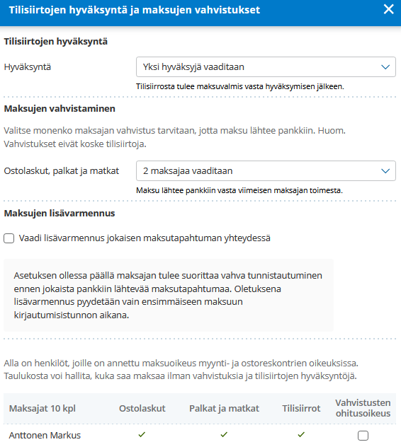 Vahvistaminen vaikuttaa myös palkanmaksuun ja tilisiirtojen osalta määritellään hyväksyntä kohdassa monen henkilön kautta tilisiirto pitää hyväksyä, että se lähtee maksuun. Jos tilisiirroille määrittelee yhden hyväksyjän, pitää tilisiirto ensin hyväksyä yhden henkilön toimesta ja sitten toinen henkilö voi siirtää tämän maksuun. Tästä löytyy lisää infoa Tilisiirtojen hyväksyntä ohjeessa.