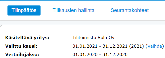 Tilinpäätöksen valittu kausi on nyt oletuksena viimeisin päätetty "lukittu" tilikausi. Valitun kauden voi vaihtaa oletuksesta toiseksi "Vaihda"-linkistä klikkaamalla. Mikäli yrityksessä ei ole yhtään päätettyä tilikautta, oletuksena näytetään aktiiviseksi valittu tilikausi. Mikäli viimeisin tilikausi on sinetöity eli siirretty tilikausiarkistoon, näytetään oletuksena seuraava avoin kausi.