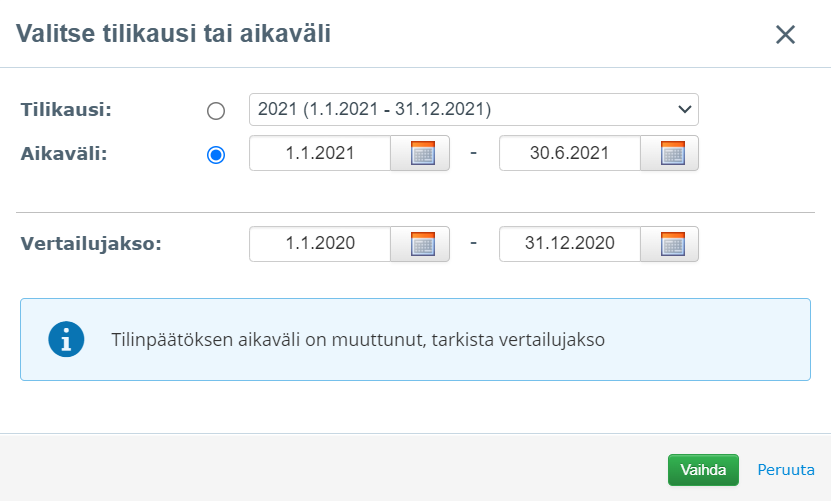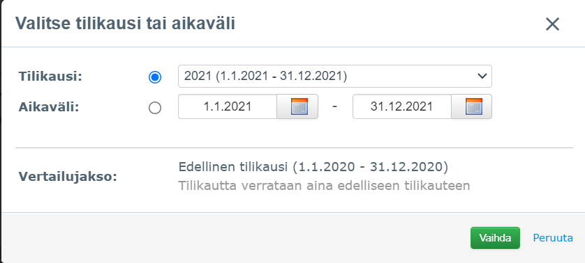Vaihda-linkki avaa tilikauden/aikavälin valinnan ja Jatka-painikkeella päästään valitulla tiedolla takaisin tilinpäätöksen koostamiseen. Aktiiviseksi kaudeksi voidaan asettaa myös muu kuin tilikausi, jolloin tilinpäätösdokumentit on mahdollista saada siistissä muodossa kyseiselle aikavälille esimerkiksi Välitilinpäätöstä varten. Kun alla olevasta näkymästä täpätään Aikaväli-kenttä tilikauden sijasta, on tällöin mahdollista määrittää vertailujakson pituus haluamalleen aikavälille.