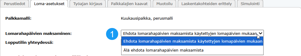 - Valitse pudotusvalikosta "Lomarahapäivien maksaminen" haluttu asetus (katso kuva alla, kohta 1).