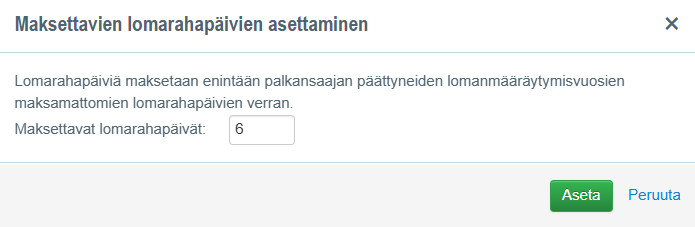 - Aseta avautuvassa näkymässä "Maksettavat lomarahapäivät" kerralla kaikille palkansaajille.