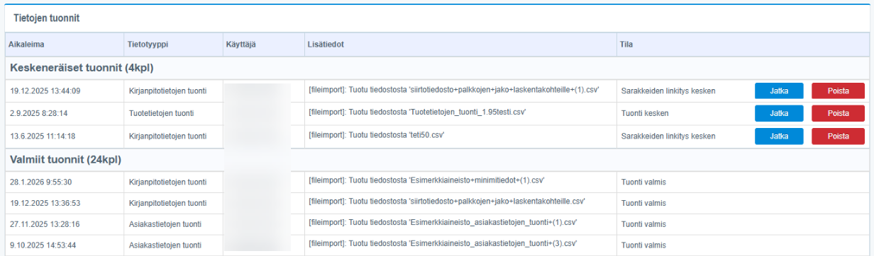 Keskeneräiset tuonnit Tästä näkee keskeneräisen tuonnin aikaleiman, tietotyypin, käyttäjän, lisätiedot ja tilan. Jatka -painikkeesta pääsee jatkamaan kesken jäänyttä tuontia. Poista -painikkeesta pääsee poistamaan keskeneräisen tuonnin.