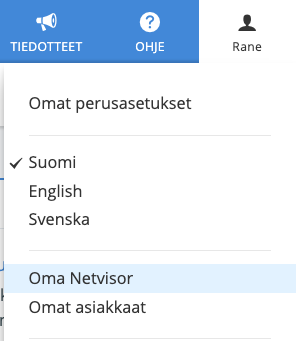 Oma Netvisor löytyy myös oman nimen alta avautuvasta valikosta. Oman nimen alta avautuvasta valikosta löytyy lisäksi Omat asiakkaat, josta päästään valitsemaan Oma Netvisorissa näkyvät asiakkaat. Yrityksen saan lisättyä Omat Asiakkaat -näkymään, jos käyttäjällä on kyseiseen yritykseen kirjanpitäjä -rooli tai palkanlaskija -rooli, jolla voi lisätä palkka-asiakkaita.