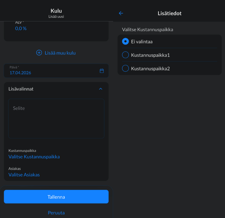 - Lisää tarvittaessa lisävalinnoista kululle kustannuspaikka ja selite. Palkansaajan oletuslaskentakohteet ovat valittuna automaattisesti.