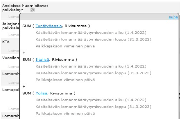 Mikäli käytössä on LomaKTA- tai LomaKPA-laskenta, klikkaa "harmaata nuolta" tarkistaaksesi ansioissa ja jakajissa huomioitavat palkkalajit.