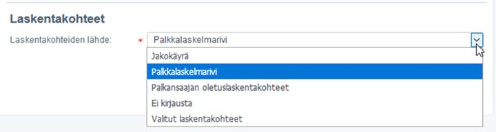 - Tämän jälkeen voit valita yrityskohtaisissa palkkalajeissa palkkalajin asetuksiin laskentakohteen lähteen.