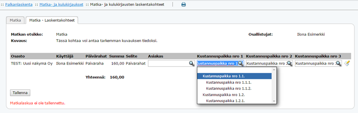 - Aseta matka- ja kulurivien laskentakohteet matkalaskunäkymän toiselta välilehdeltä. Jos palkansaajan taakse on asetettu oletuslaskentakohteita, tiedot tulevat oletuksena palkansaajalle luodulle kuluriville.