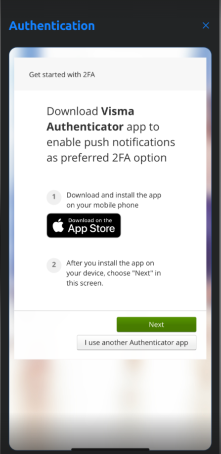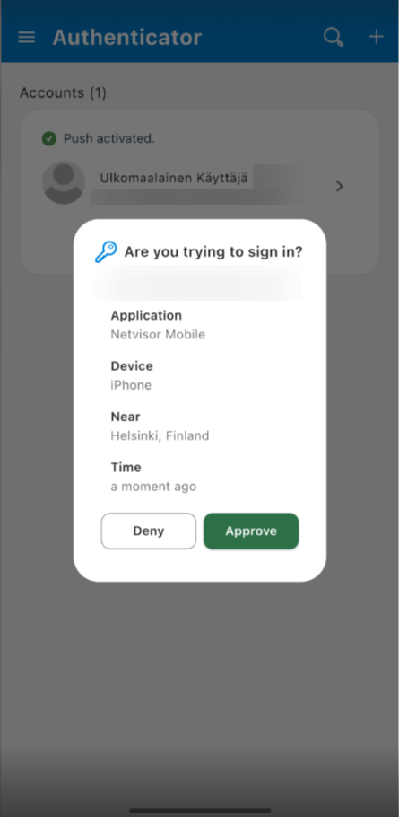 Kaksivaiheinen tunnistus on sisäänkirjautumisen tietoturvaa parantava ominaisuus, joka tarkoittaa sitä, että kirjautumisen yhteydessä Netvisor pyytää sinulta lisävahvistuksen. Valinnastasi riippuen sinun tulee tehdä tämä lisävahvistus joko hyväksymällä älypuhelimeesi saapuva push-ilmoitus Visma Authenticatorissa, tai muulla käyttämälläsi Authenticatorilla.