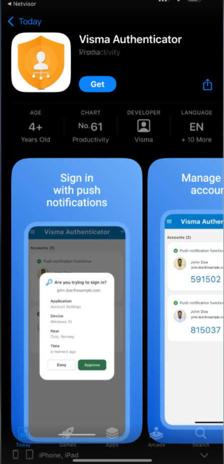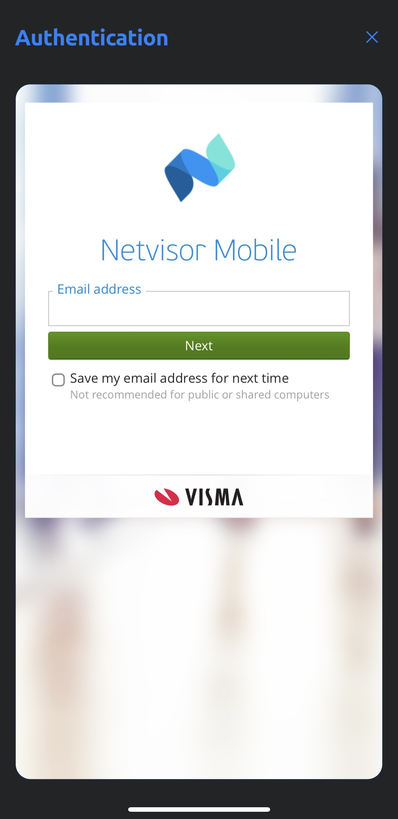 Avaa Visma Authenticator sovellus ja lisää Authenticatoriin oma Visma Connect tunnuksesi. Sitten saat vahvan tunnistautumisen vahvistuksen Netvisor Mobiilin kirjautumisesta hyväksyttyä Visma Authenticatorilla.