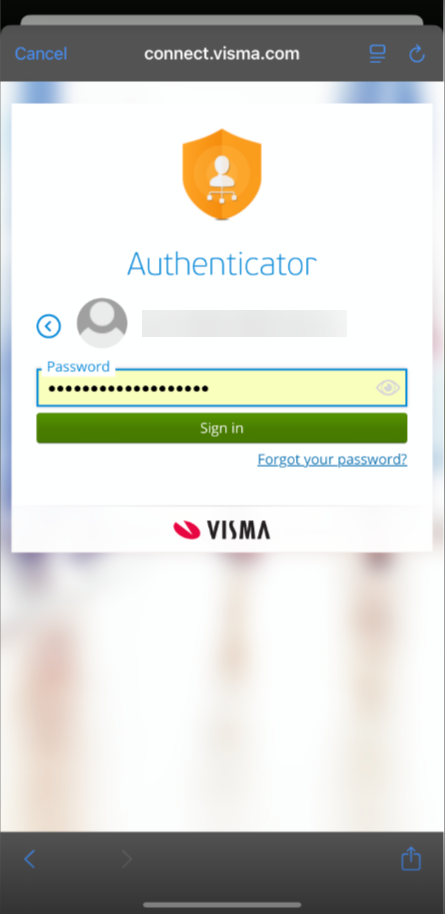 Syötä tässä kohtaa Visma Connect tunnuksesi Visma Authenticatoriin.
