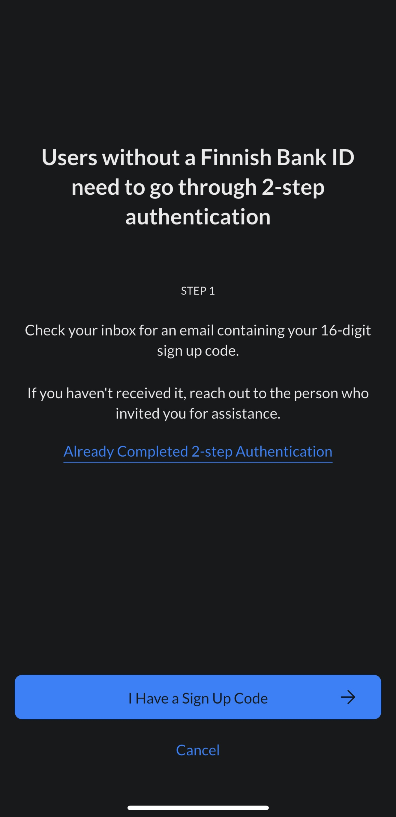 Aloita kirjautuminen valitsemalla mobiilisovelluksess "Ei suomalaista pankkitunnusta?" jonka jälkeen avautuu valittavaksi "Already completed 2-step Authentication".