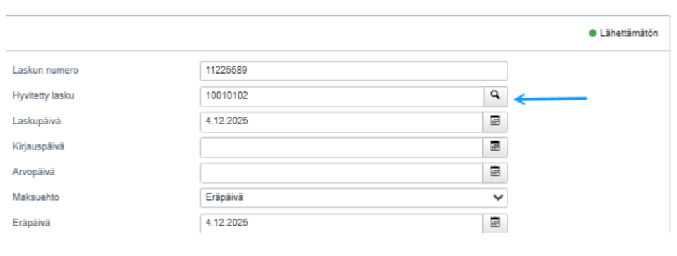 HUOM! Mikäli laskut tuodaan integraatiolla, tulee hyvityslasku tuoda tositteettomana. Kun hyvityslasku näkyy Netvisorissa, pitää hyvityslaskulle käydä hakemassa oikea laskunumerotieto kohdasta “Hyvitetty lasku”. Näin hyvitettävän laskun tieto menee sanomalla myös Amili Kassavirta -palveluun.