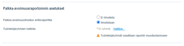 Ilmoitetaan Palkka-avoimuusraportointi on aktiivinen. Tämä valinta tekee työntekijäryhmien hallinnasta pakollista. Järjestelmä näyttää huomautuksen: "Työntekijäryhmät vaaditaan raportin muodostamiseen."