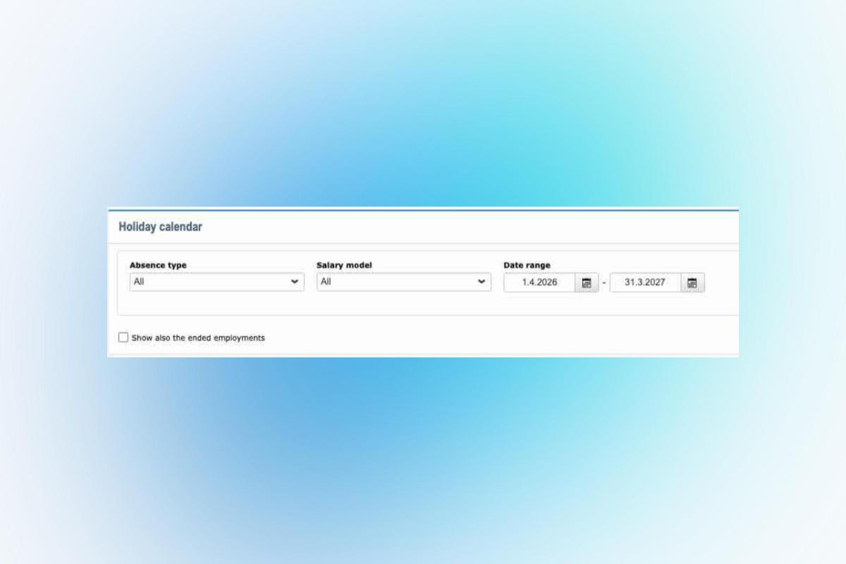 We have updated the layout of the Holiday calendar report and added the option to filter the report by payroll model. The updated holiday calendar can be found in its usual place: Salaries > Holidays > Holiday calendar. The ended employments will no longer be shown on the report by default, but they can be included by selecting "Show also the ended employments" in the search criteria.