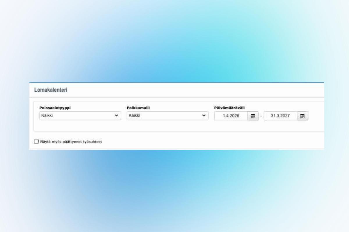 Uudistimme lomakalenteri-raportin ulkoasua ja lisäsimme mahdollisuuden rajata raporttia palkkamalleittain. Uudistunut lomakalenteri löytyy tutusta paikasta Palkat > Lomat > Lomakalenteri. Jatkossa päättyneet työsuhteet eivät näy raportilla oletuksena, mutta ne voidaan lisätä raportin hakuehdoista mukaan valittavaksi hakuun täppäämällä "Näytä myös päättyneet työsuhteet".